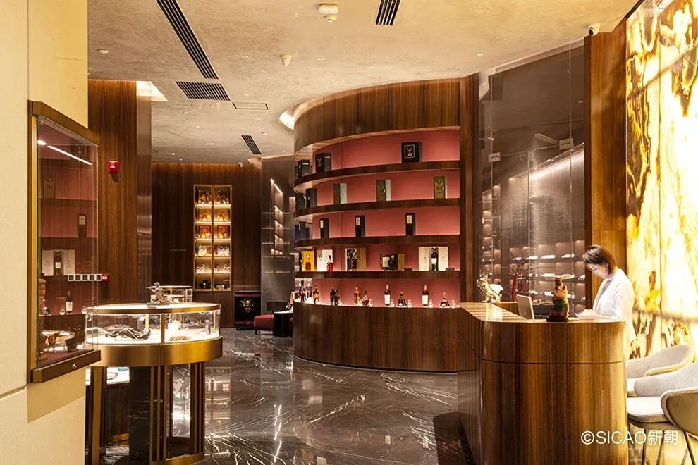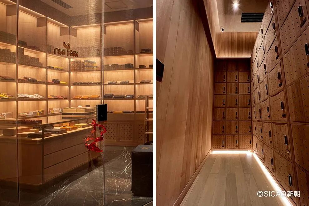 The cigar area, covering an area of approximately 50 square meters, is divided into three separate spaces: the exhibition and sales area, the public storage area, and the VIP storage area. The cigar humidification cabinets inside are all meticulously crafted from authentic Peruvian cedar wood.